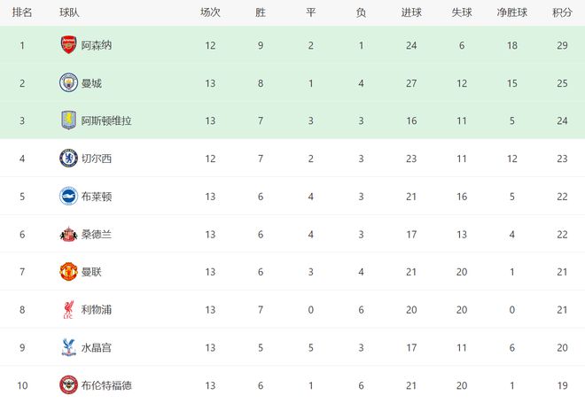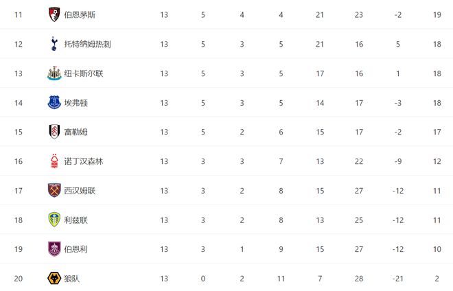 前一个比赛日,曼城3-2绝杀利兹联,热刺1-2输给富勒姆,桑德兰3-2险胜伯恩茅斯,布伦特福德3-1击败伯恩利,埃弗顿1-4惨败纽卡斯尔。